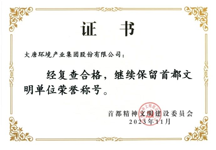 本網(wǎng)訊?近日,首都精神文明建設(shè)委員會(huì)頒發(fā)了“首都文明單位”復(fù)查合格證書(shū),大唐環(huán)境產(chǎn)業(yè)集團(tuán)股份有限公司繼2015年獲得“首都文明單位”稱號(hào)后,順利通過(guò)復(fù)查,連續(xù)保持9年“首都文明單位”稱號(hào)。