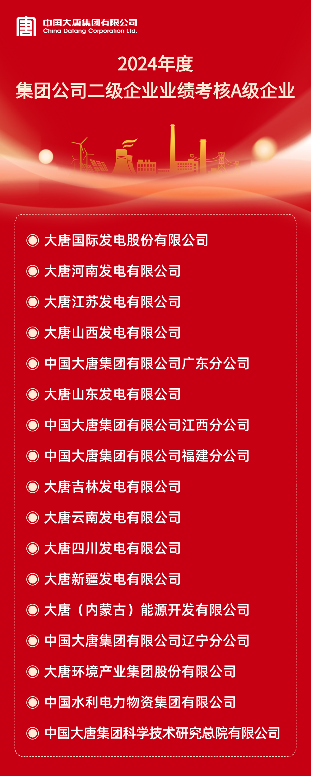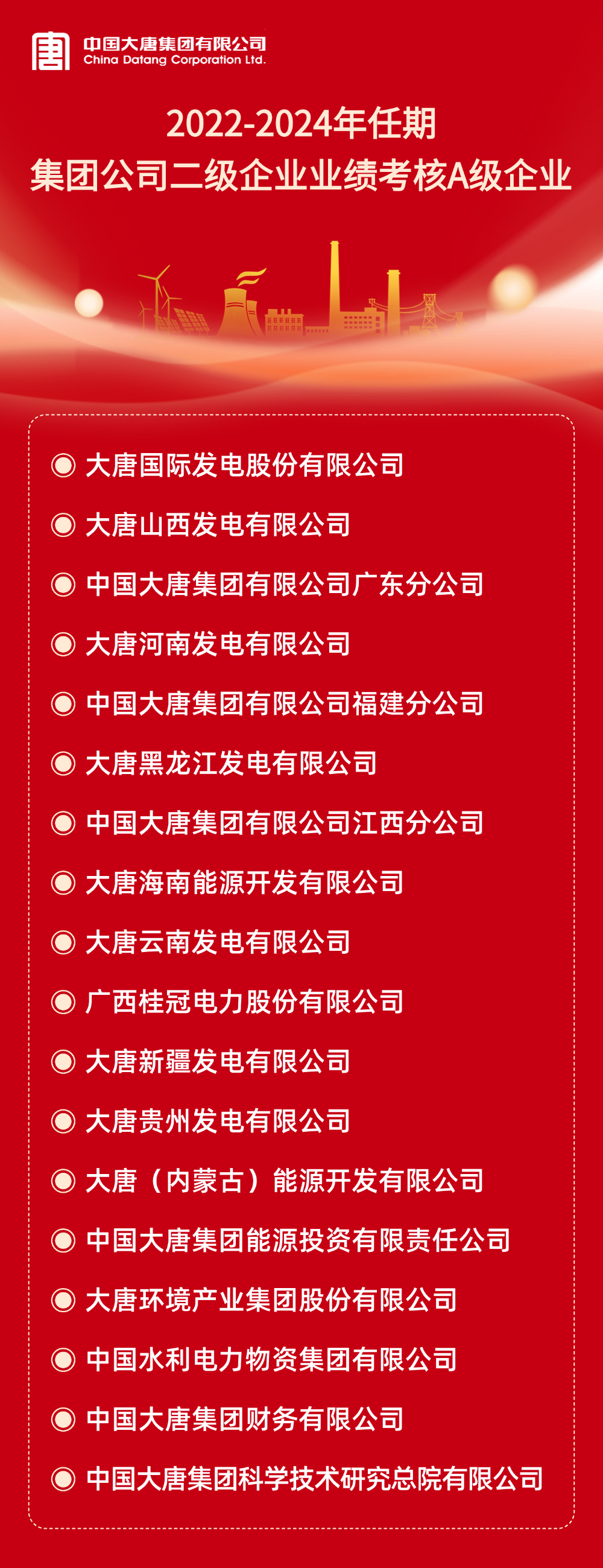 本網(wǎng)訊 根據(jù)《中國大唐集團有限公司所屬企業(yè)年度業(yè)績考核辦法》和《中國大唐集團有限公司所屬企業(yè)任期業(yè)績考核管理辦法(試行)》及有關(guān)規(guī)定,2024年度及2022-2024年任期二級企業(yè)業(yè)績考核結(jié)果已經(jīng)集團公司董事長專題會審議通過。A級企業(yè)名單如下: