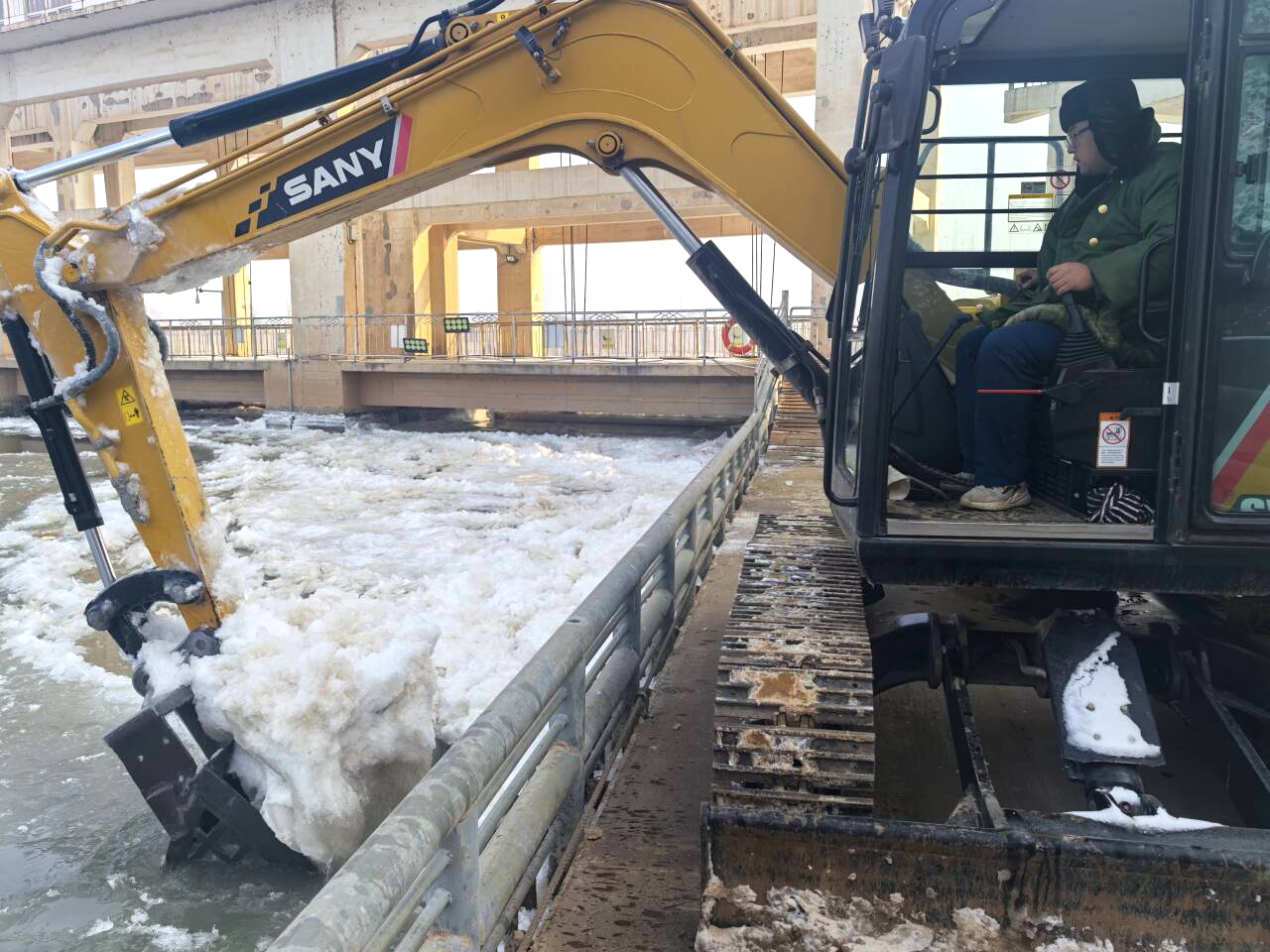 李寧駕駛著除冰機,緩緩靠近攔污柵。機器的轟鳴聲在寒冷的空氣中回蕩。他小心翼翼地操作著,確保每一次的沖擊都能精準(zhǔn)地?fù)羲楸鶎?,而不會對攔污柵造成損傷。