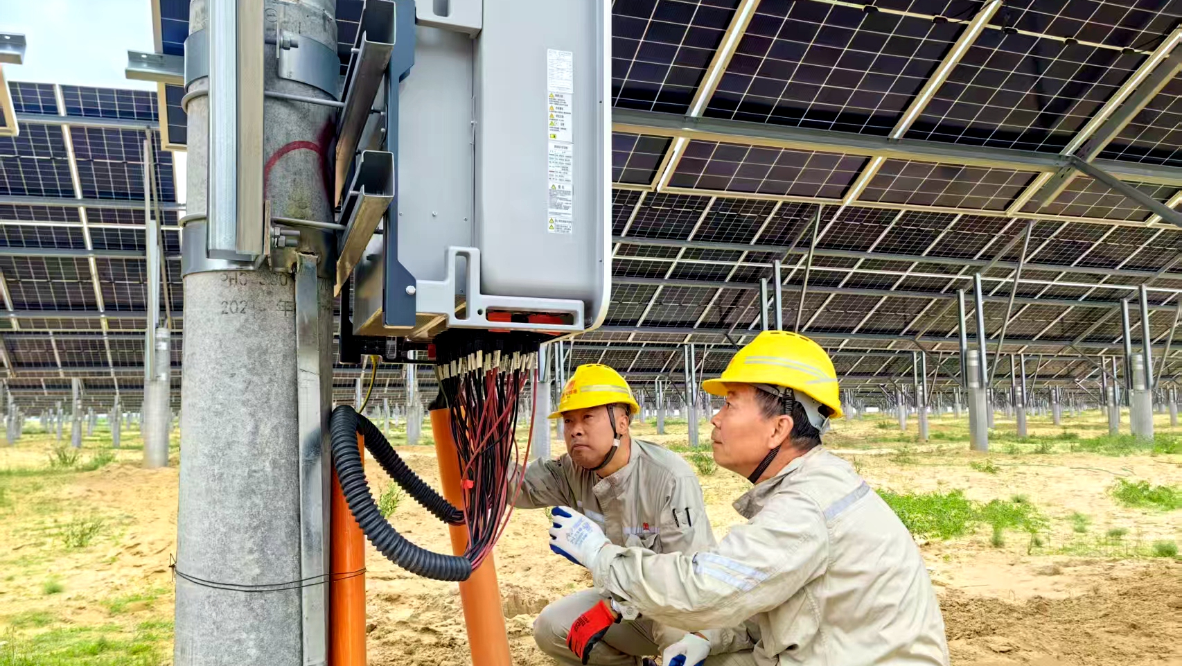 當我有幸成為其中一員,真正走近他們身邊,才得以親身體驗這群追光人在9月的別樣工作與生活。聊起近況,他們立刻打開了話匣:“王欣,你剛到這兒,9月的沙漠早晚涼,可得多穿件衣服。工作上嘛,更要守規(guī)矩、保安全,認真仔細把活兒干好——每一塊光伏板都高效運轉(zhuǎn),咱們才能安心。生活里咱就熱熱鬧鬧的,晚上一起煮碗熱湯,跟一家人似的?!弊叱錾龎赫荆矍氨闶且煌麩o際的光伏區(qū),數(shù)萬塊藍色組件整齊排列,如同一面面挺括的旗幟,在沙海中傲然矗立。光伏板與箱變間的距離不遠,仿佛手手相牽;可對運維人員來說,要在一個月內(nèi)給1443畝土地上的16臺箱變、成百上千臺逆變器和組件做兩次全面巡查,這事看似簡單,做起來卻絕非易事。