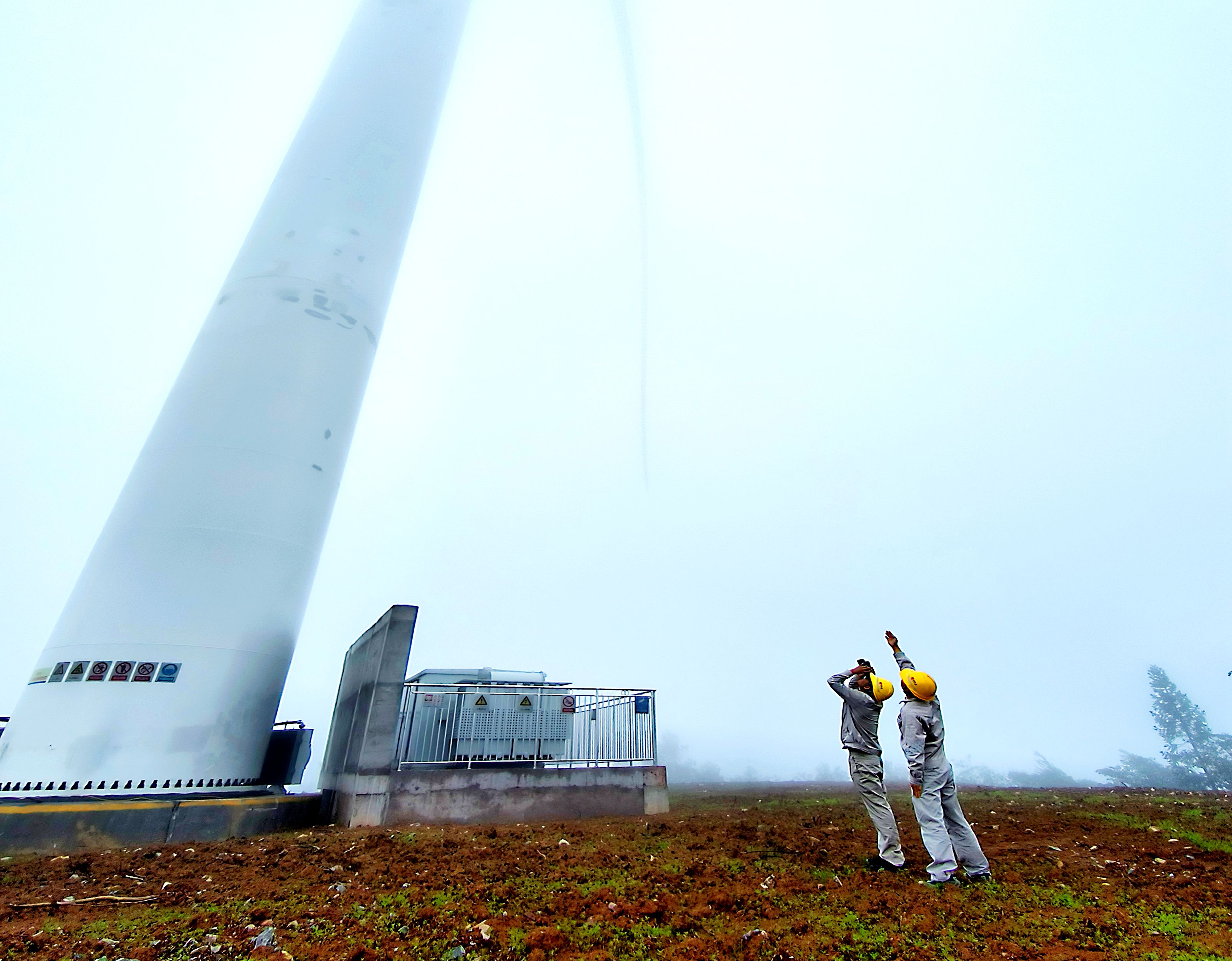 一陣山風(fēng)吹來,站在風(fēng)機塔下,幾個人都不由自主地緊了緊身上的大衣。云霧迅速流動了起來,風(fēng)機的三個葉片和整個塔筒,慢慢從云霧中露出了“真容”。