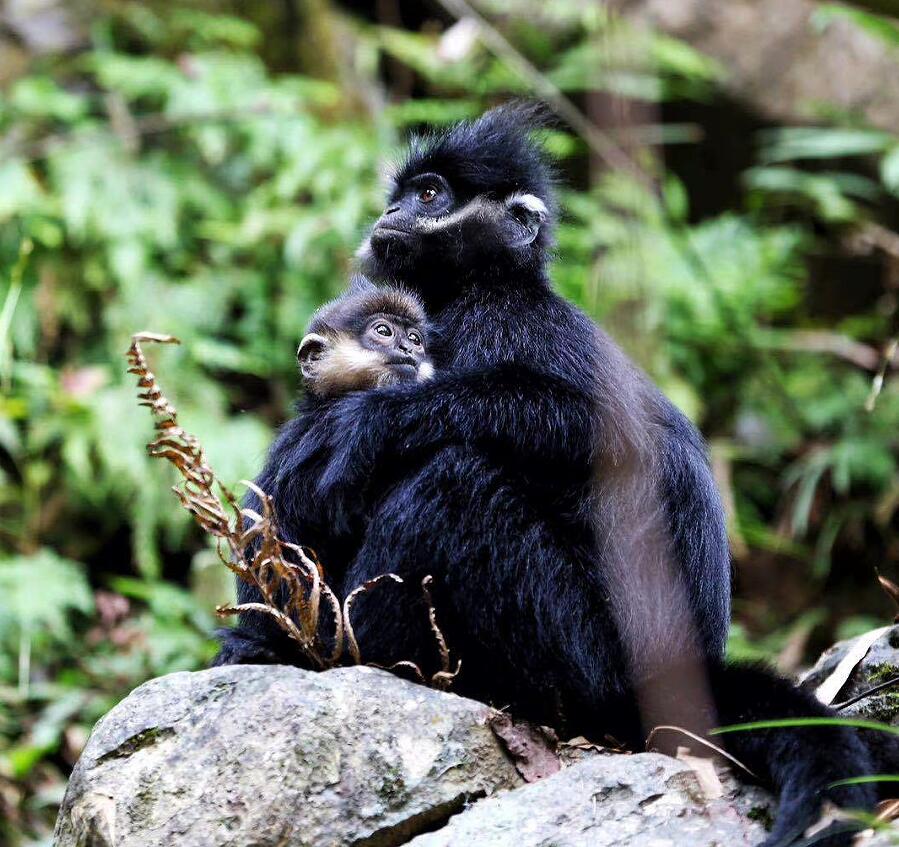 經(jīng)過長途奔波,快艇行駛到貴州省沿河縣境內(nèi)的“麻陽河國家級自然保護(hù)區(qū)”。山上傳來各種表達(dá)不同“情緒”的叫聲,在生態(tài)環(huán)保專業(yè)崗位奮斗8年之久的饒振祺朝密林中一指:“快看,那就是黑葉猴!發(fā)出‘嘎,嘎’的叫聲,說明它們處在愉快的覓食狀態(tài)中;‘噢、噢’就是它們在山林間攀援前進(jìn)的信號?!碧а弁?,巖石間、樹蔭深處不斷有黑葉猴迅捷地跳躍。它們頭頂冠毛蓬松,通體黑色,兩頰雪白的“絡(luò)腮胡”格外醒目,看起來像銀須飄飄的“小老頭”。有的黑葉猴懷里還抱著“金寶寶”——幼猴毛色金黃,隨年齡增大變黑。