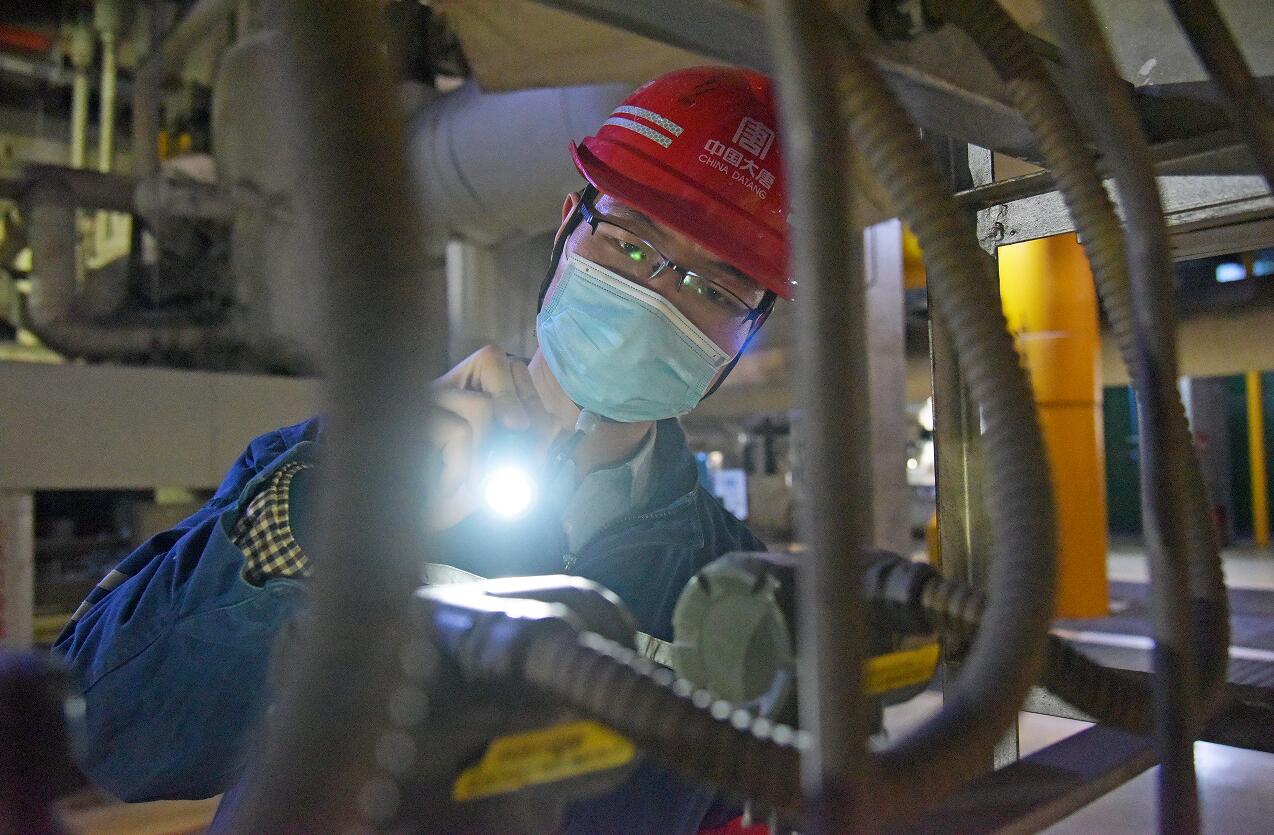 設備部電控點檢員正在檢查熱網(wǎng)系統(tǒng)參數(shù)