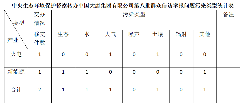 2025年6月11日,中央第七生態(tài)環(huán)境保護(hù)督察組向中國(guó)大唐集團(tuán)有限公司移交第八批群眾信訪舉報(bào)件,共計(jì)2件,均為來(lái)電舉報(bào),涉及生態(tài)問(wèn)題1個(gè)、水問(wèn)題1個(gè)、大氣問(wèn)題1個(gè)、土壤問(wèn)題1個(gè)、其他問(wèn)題1個(gè)。所有舉報(bào)件辦理工作已第一時(shí)間進(jìn)入調(diào)查核實(shí)辦理程序,辦理情況將按照相關(guān)要求反饋督察組,并及時(shí)向社會(huì)公開(kāi)。