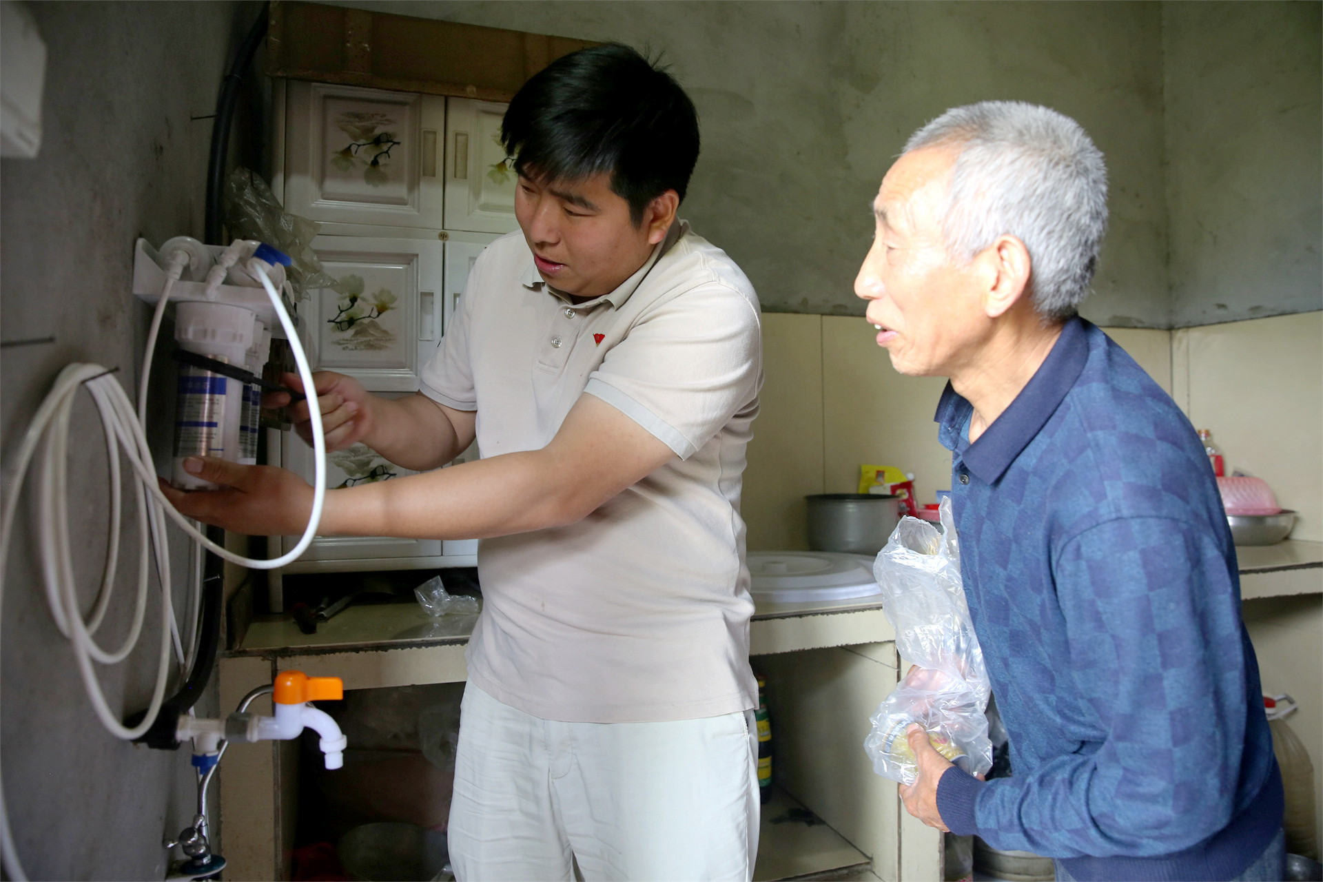 向老劉講授更換凈水器濾芯方法
